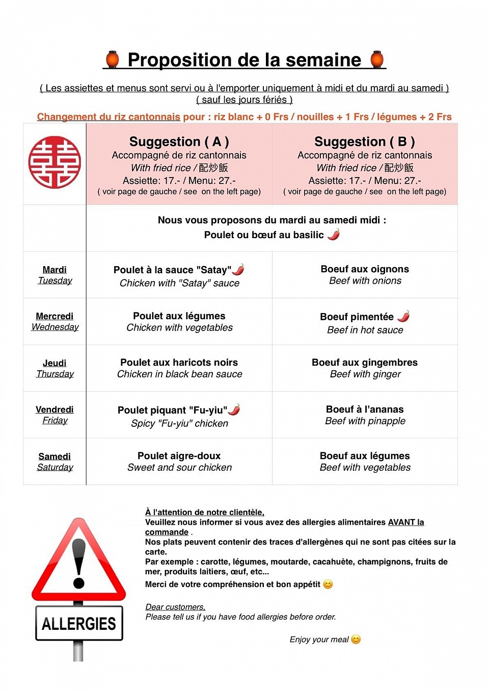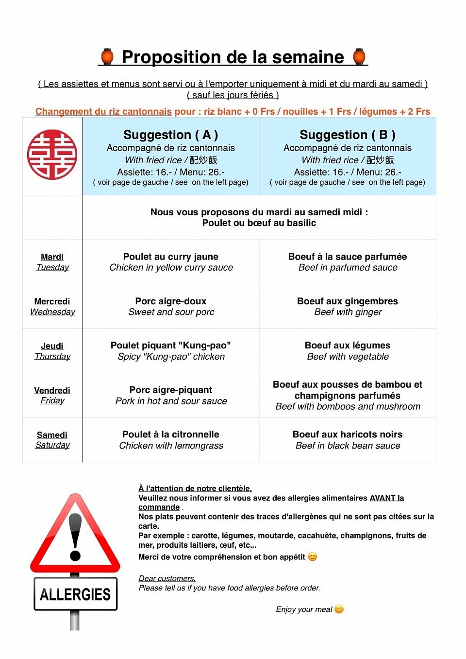 Nos assiettes (A) ou (B) coûtent 16.- et sont accompagnées de riz cantonnais et d'une salade chinoise.